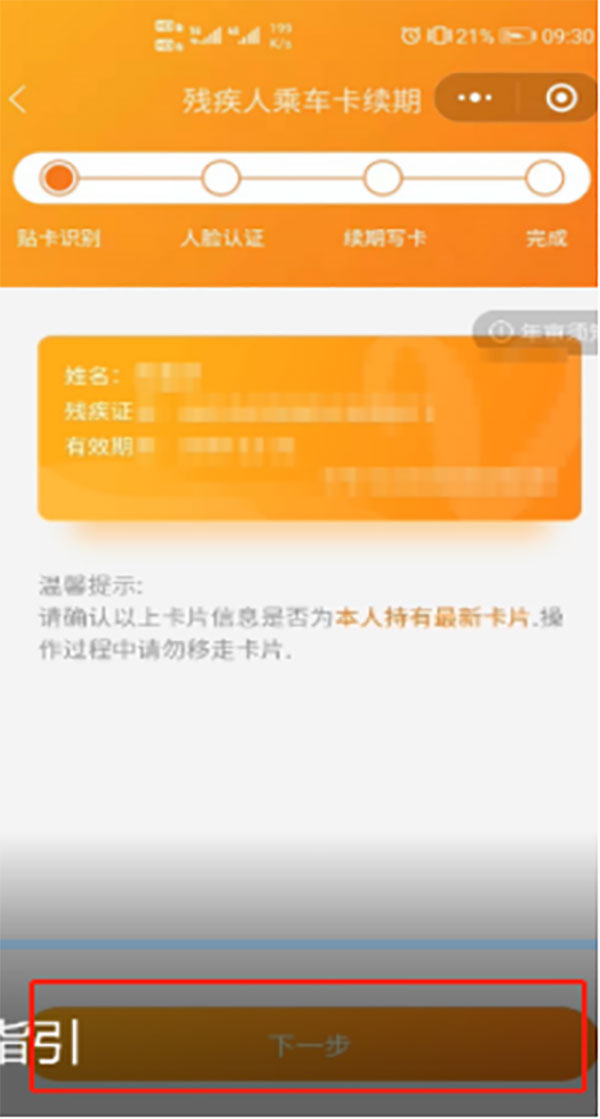 ?。ㄎ澹┙屑踩顺顺悼ㄌ谑只趁鍺FC感应取进行读卡,确认信息后点击“下一步