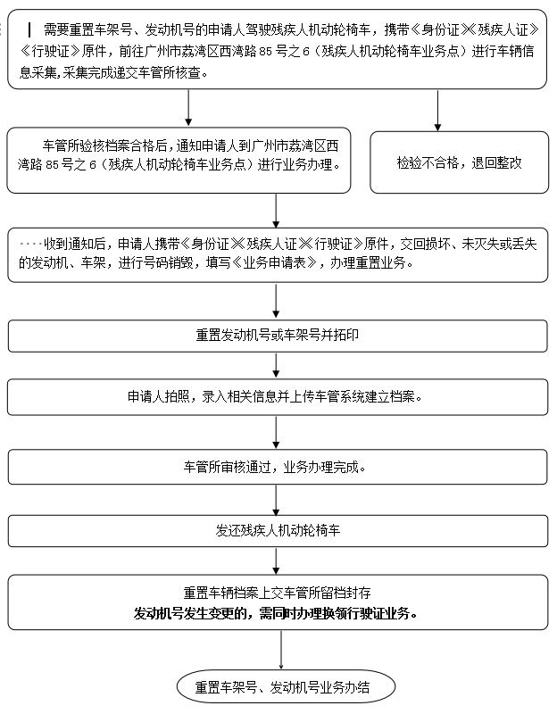 办理流程 | 1.申请人驾驶残疾人机动轮椅车,携带《中华人民共和国居民身份证》、《中华人民共和国残疾人证》或《中华人民共和国残疾军人证》、《残疾人机动轮椅车行驶证》原件,前往残疾人机动轮椅车业务点,进行车辆信息采集,采集完成递交车辆管理所核查,车辆验核合格后通知申请人办理; 2.交回损坏、未灭失或丢失的发动机、车架,进行号码销毁; 3.重置新发动机号、车架号。 发动机号发生变更的,需同时办理换领行驶证业务 |